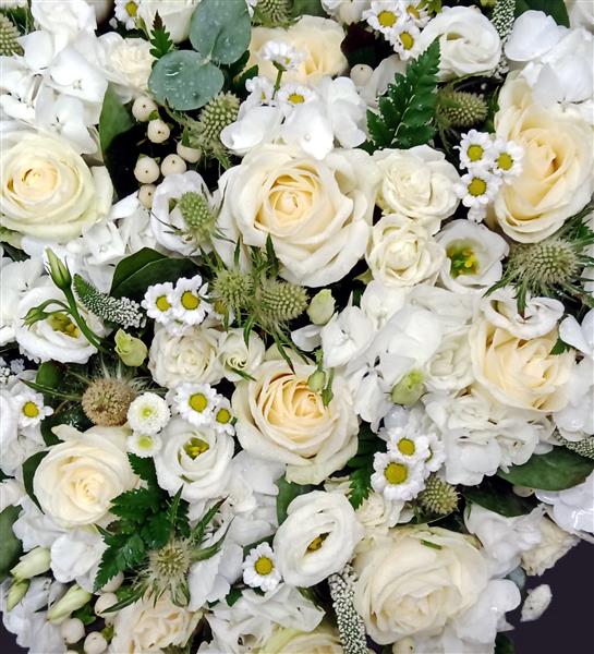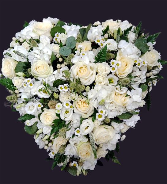 A large 18" classic neutral shades heart featuring white and cream roses, hydrangea and lisianthus