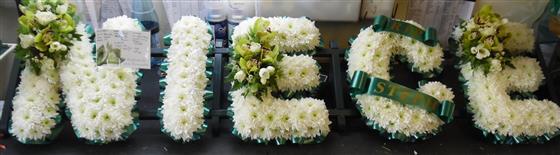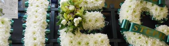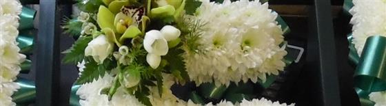 Edged with green ribbon with orchids and white freesia sprays, available with or without ribbon