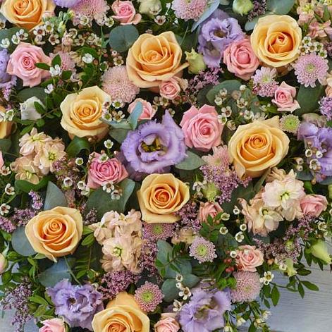 A luxurious selection of roses, lisianthus, stocks and mixed foliage in pretty pastel shades 44cm x 48cm