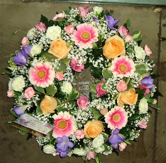 The picture shows a 12" wreath ring designed using a pretty pastel selection of flowers in shades of peach, pink and lilac. Flowers may vary due to availability. Also available in a larger size