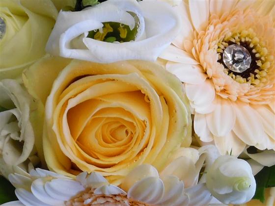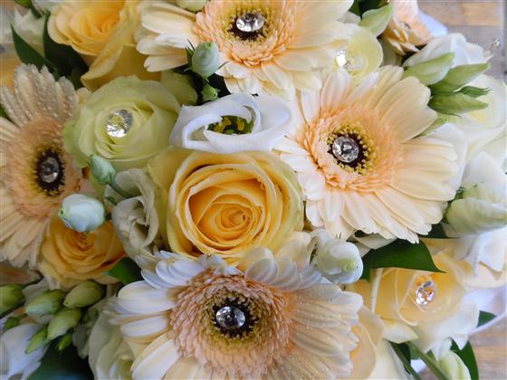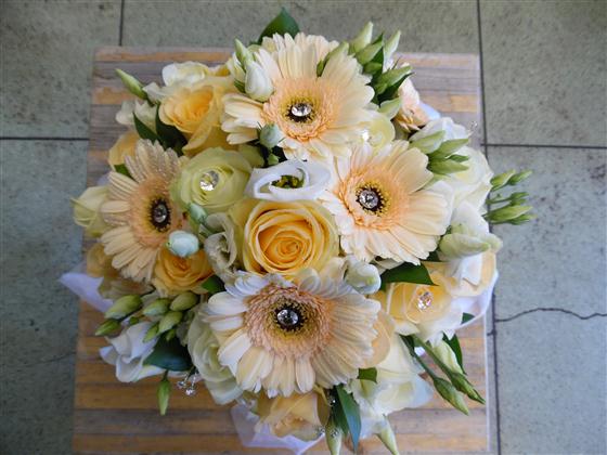 This beautiful Handtied bridal bouquet is designed using Peach roses,white roses, Lisianthus and peach germini, it is decorated with diamantes and crystal pins, the handle is finished with an Ivory organza ribbon and bow, approximate size 25cm across