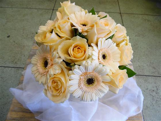 A beautiful bridemaid handtied bouquet that compliments our peach Bridal bouquet, designed using peach roses and peach germini,with ruscus foliage, finished with a peach organza ribbon handle and peach bow, this design can be made in different colours to suit your colour scheme