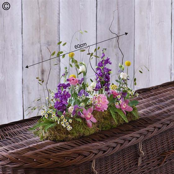 A modern linear design casket spray for something completely different, a moss covered bar with flowers arranged at different heights to create this unique design featuring orchids, lisianthus stocks and craspedia 2 sizes available, standard size shown