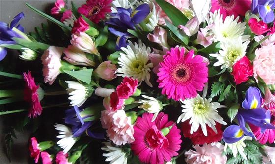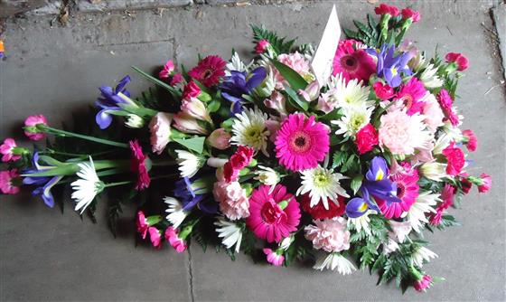 The bold shape of blue irises blend perfectly with the pink and white colours of carnations and spray carnations, spray chrysanthemums and alstroemeria. This is softened by the shape of the foliage to create this teardrop-shaped spray. 3 sizes available standard 45cm long, large 65cm long, extra large 85cm long