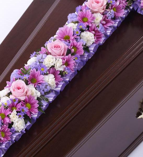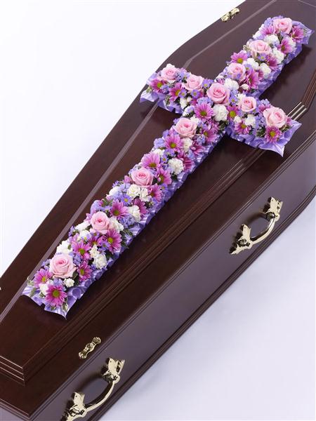 A classic cross covered with a mass of pink and lilac flowers including roses, spray carnations, spray chrysanthemums and September flower. in 4 sizes 2ft £70.00 3ft £100.00 4ft £135.00 5ft £175.00