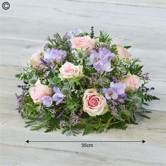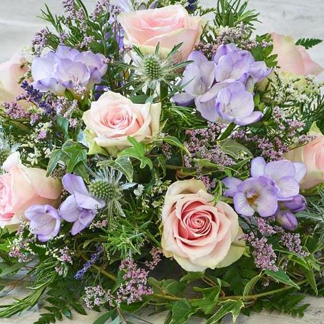 Pink Roses and scented lilac freesia are arranged with Limonium and eryngium and choice foliage to create this pretty posy design.