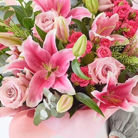 A PRETTY PINK THEMED BOUQUET FEATURING PINK ROSES AND LILIES