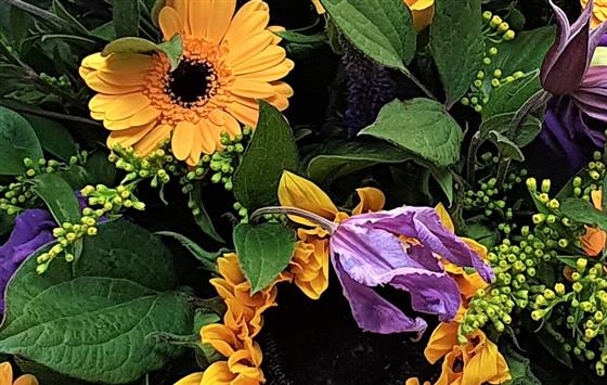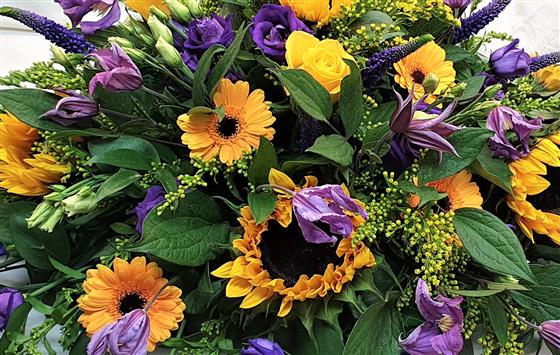 This arrangement is suitable for either a top table or a ceremony table. Made using vibrant yellows and purples, including sunflowers, roses, clematis and veronica. Length 60cm width 40cm