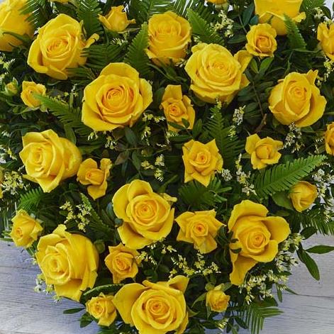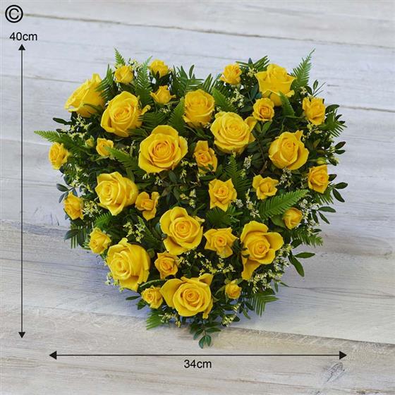 A cottage style heart made using yellow roses, spray roses and limonium with mixed foliages Standard size shown