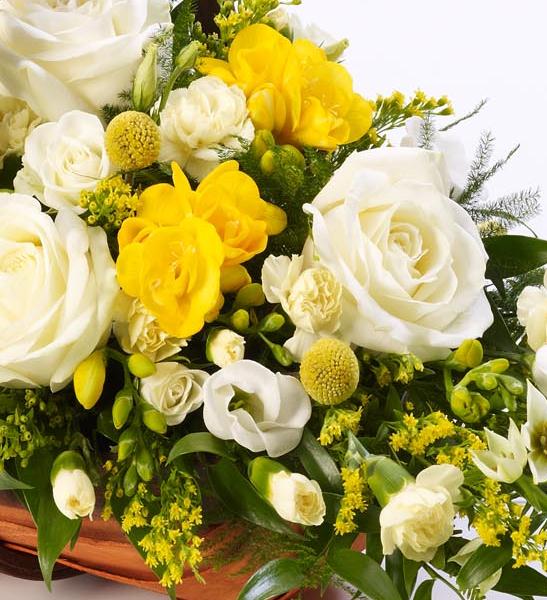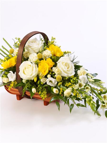 A traditional trug basket filled with roses, scented freesia, craspedia, spray carnations and ornithogalum in white and yellow arranged in a sheaf-like design. Flowers may vary due to availability. The basket is now a pale wood trug due to supply issues