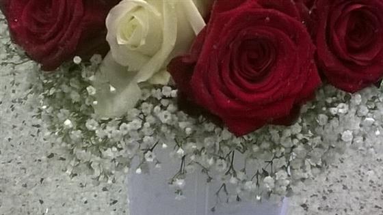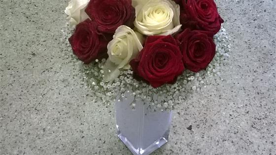 A beautiful 2 colour rose vase arrangement with a pretty gypsophilia collar, vase design may vary from pictured design