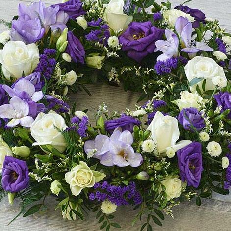 A pretty wreath in delicate shades of Purple, blue, lilac and cream made using scented freesia, roses lisianthus and limonium