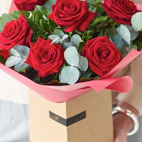 A delightful bouquet of 6 roses and foliage, presented in a stylish giftbox