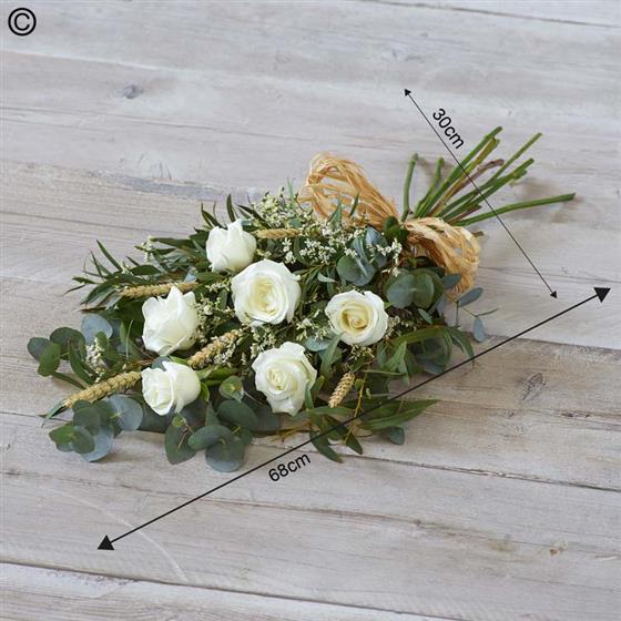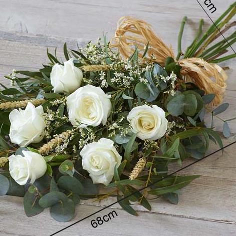 6 large-headed white roses are arranged with limonium,wheat assorted mixed foliage to create this simple, classic rose sheaf.(foliage may vary due to seasonal availability)