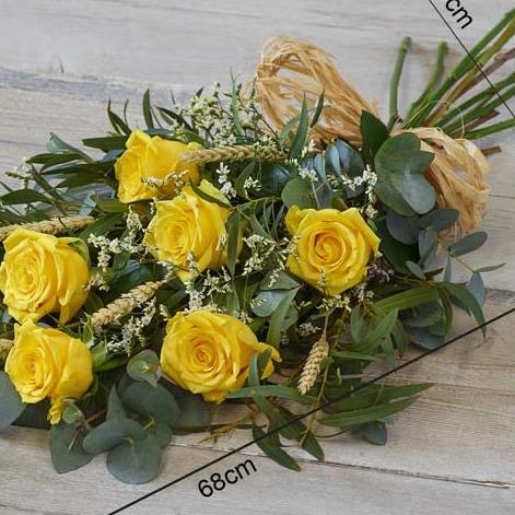 6 large-headed yellow roses are presented with mixed foliage, limonium and wheat tied with a raffia bow. This design is environmentally friendly as it is made using natural materials