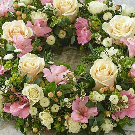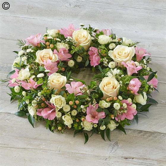 A pretty pastel wreath made using delicate roses, alstromeria,spray roses waxflower and pretty mixed foliages. Standard size shown