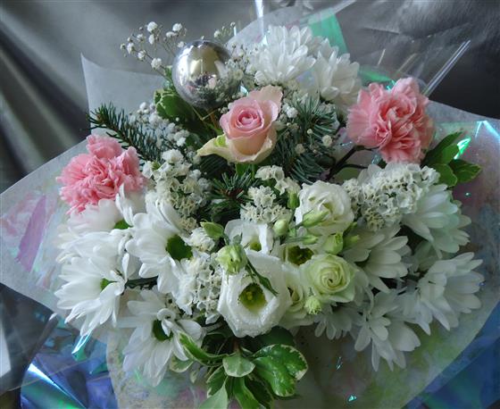 A cute giftbox featuring pink and white flowers with seasonal foliage and silver bauble, the gift box is tied with pale blue hessian ribbon and finished with a wooden star ornament