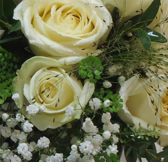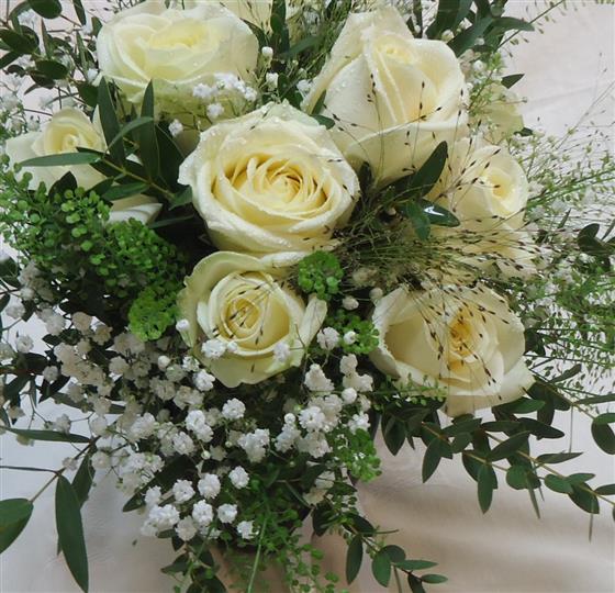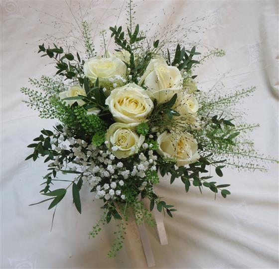 A pretty bouquet of white roses with eucalyptus, thalaspi, grasses and gypsophilia, with the addition of satin ribbon trails, a lovely design for both brides and bridemaids