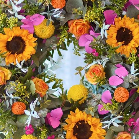 Who says wreaths are just for Christmas? This gorgeous one will celebrate the vibrant colours of summer and feature fresh blooms in shades of cerise, saffron and tangerine with pops of blue. You might also see painted or dried foliage.