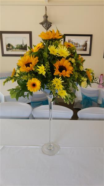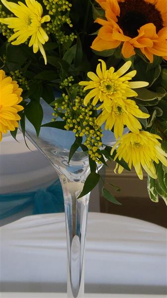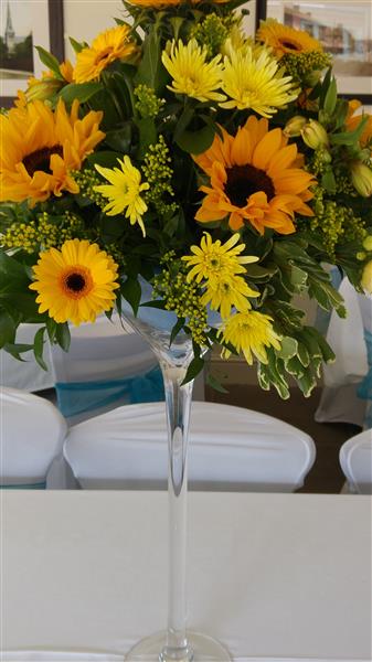 A sunny summer wedding table centre filled with sunflowers, yellow germini Price includes the martini glass, please phone for prices if you would prefer to hire the glassware.