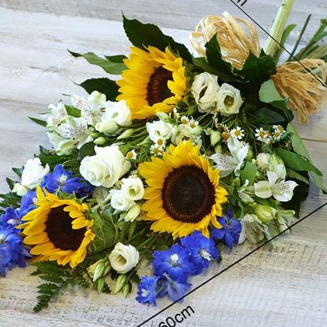 A natural sheaf tied with a raffia bow featuring sunflowers, lisianthus and delphinium. Environmentally friendly design