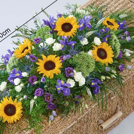 A bright colourful casket spray with Sunflowers as the main focus, with Iris, Lisianthus, Veronica and eryngium and mixed foliages