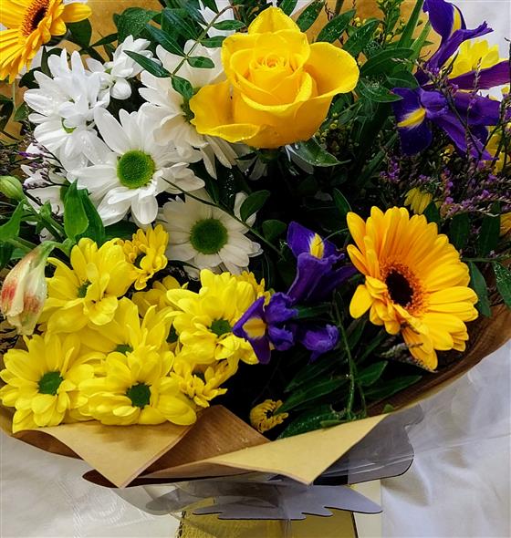 A bright sunny selection of flowers and foliage in lemons, whites and purples Hand picked and tied together by one of our expert florists, gift wrapped and delivered in a water bubble and gift box. Flowers and wrapping may differ slightly from picture due to availability.