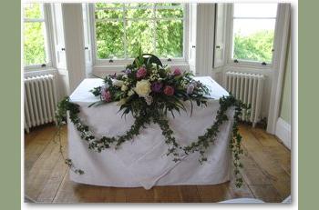 This stunning table design is suitable for a top table or a registrar table it is designed using mixed roses, lisianthus, freesia and an abundance of mixed foliage and is completed with a garland of ivy. The size is approximately 75cm long x 45cm wide x 30cm tall and can be designed using flowers to compliment your own wedding theme