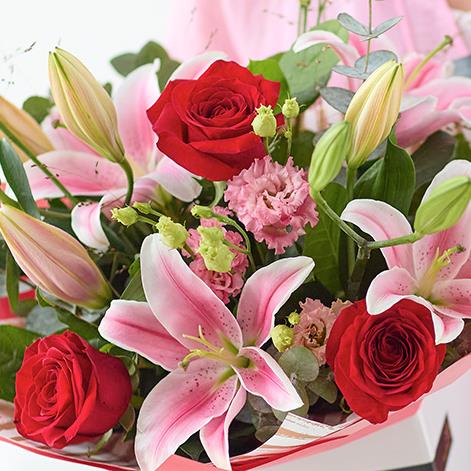 A gorgeous mix of flowers featuring red roses and pink oriental lilies