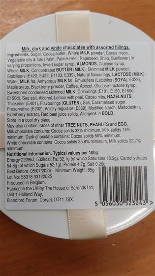 Chocolates contain: milk, butter, lactose, tree nuts, gluten & soya. May contain traces of: egg, tree nuts and peanuts.