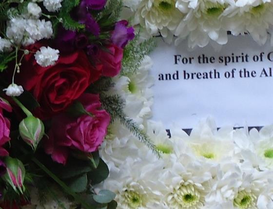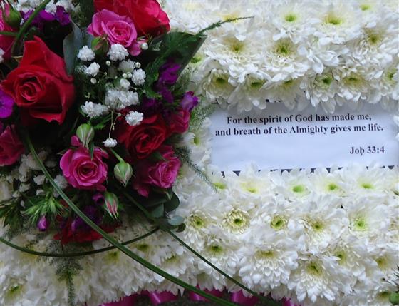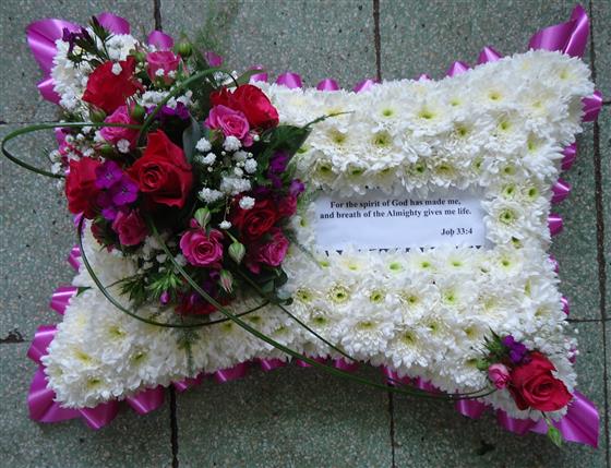A Bright colourful pillow with the addition of a verse, psalm or quote of your choice. Other colours of ribbon and spray are available. Pillow size 38cm (15") 0r 46cm (18")