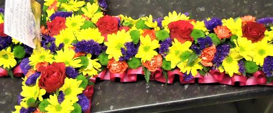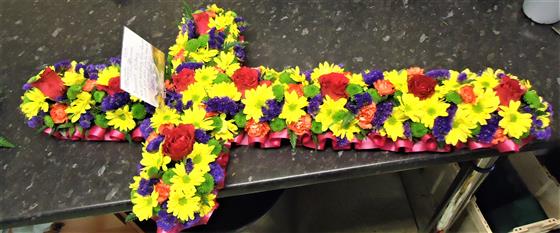 A classic cross covered with a mass of flowers in vibrant shades including roses, spray carnations, spray chrysanthemums and statice. available in 2 sizes 3ft and 4ft