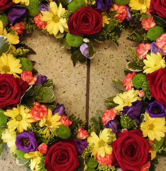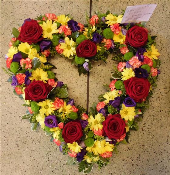 The perfect tribute for a loved one, this open heart shaped display includes fresh flowers in contrasting colours. We’ve included cerise or red roses, golden yellow spray chrysanthemums, orange spray carnations, cool purple statice and lime green spray chrysanthemums. 18" size shown