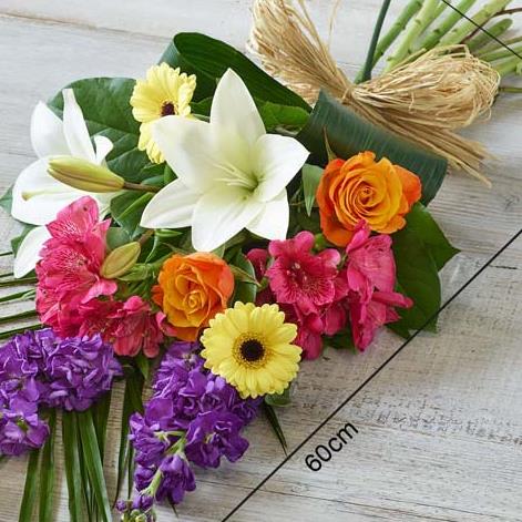 A vibrant scented sheaf made using stocks , germini lilies and roses tied with mixed foliage and a raffia bow. This sheaf is environmentally friendly as it is made of all natural materials 3 sizes available, standard size shown
