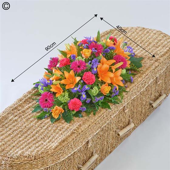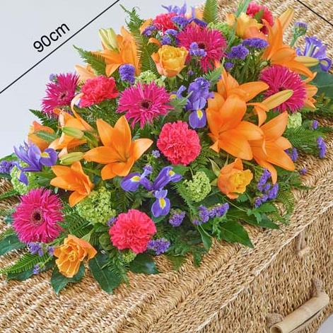 A selection of seasonal vibrant flowers in shades of cerise, orange ,purple and green. Available in 3 sizes 3ft(90cm) size shown