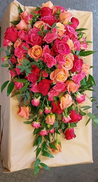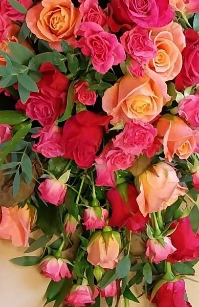 A gorgeous vibrant cerise pink, coral and orange roses designed in this traditional shower bouquet