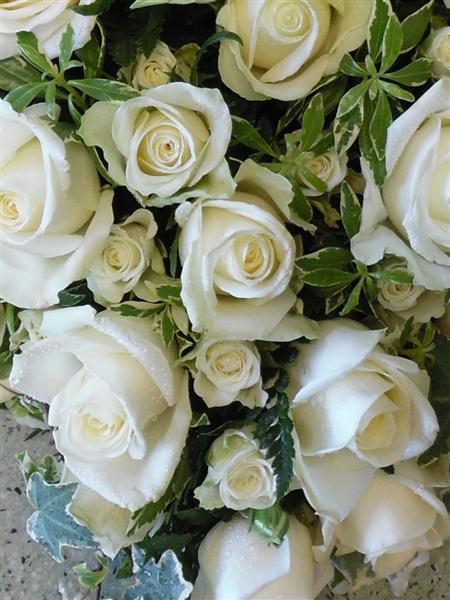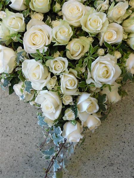 This beautiful Rose heart is designed using large headed roses and spray roses with variegated foliage and Ivy trim 13" size shown