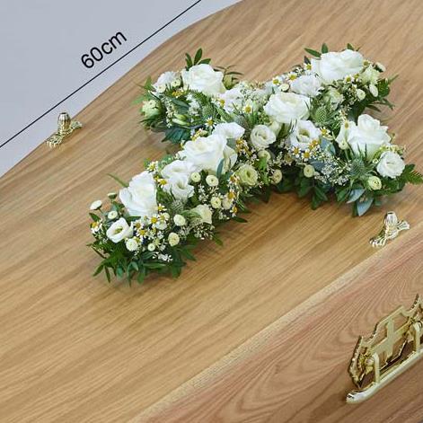 A petite cross in pure white including roses, lisianthus, spray chrysanthemums and thistle, with mixed foliages. Available in 3 sizes. 2ft 60cm size shown