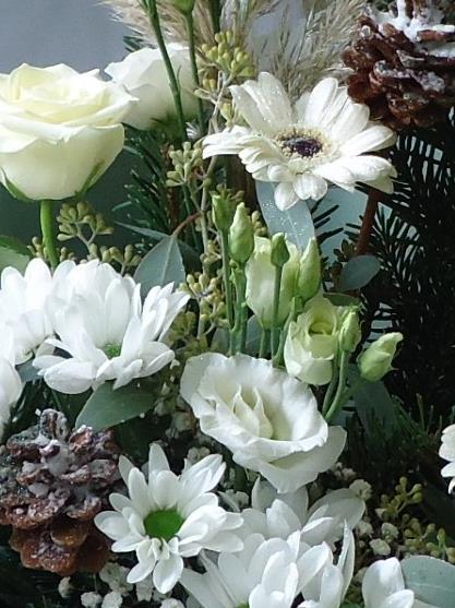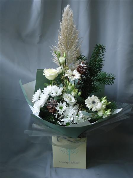 A lovely Winter giftbox with a touch of sparkle, white flowers and seasonal foliage are tied together and presented in a cute giftbox