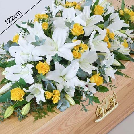 A beautiful casket spray of yellow roses, White lilies and mixed foliages 3 sizes available
