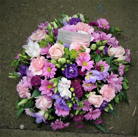 A classic selection in lilac and pink including large-headed roses, lisianthus and chrysanthemums. standard size 30cm wide large size 40cm wide extra large size 50cm wide.(LARGE SIZE SHOWN) Flowers may vary due to availability
