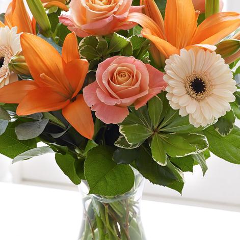 A stylish vase filled with a selection of seasonal flowers in Peach and orange with mixed foliages (flowers may vary due to availability)