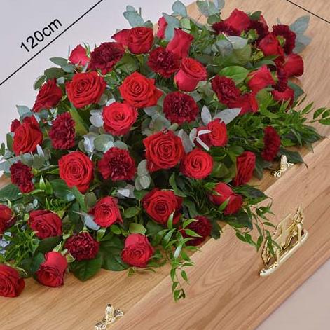 Large-headed red Rose combine with red carnations and luxurious foliages to create this traditional casket spray. Available in 3 sizes 3ft, 4ft, 5ft