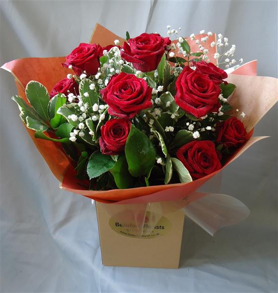 Featuring large headed red roses hand-tied with various assorted foliages , presented in Kraft Gift Packaging. STANDARD- 12 RED ROSES. LARGE-18 RED ROSES. EXTRA LARGE - 24 RED ROSES
