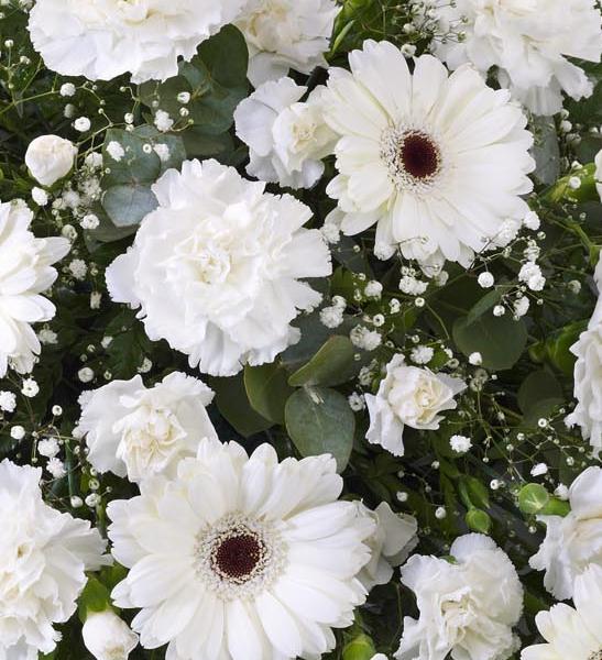 Fresh carnations, spray carnations, germini and gypsophilia, all in pristine white, are beautifully arranged in a teardrop shaped spray. We’ve added dark green leather leaf and fragrant eucalyptus to finish this graceful tribute.