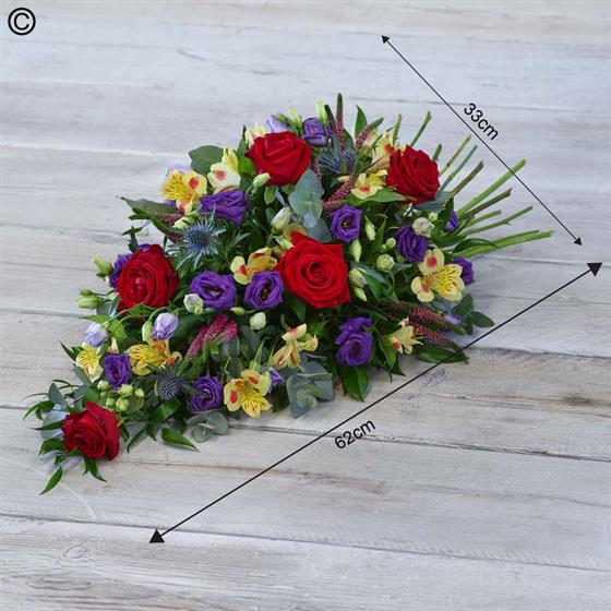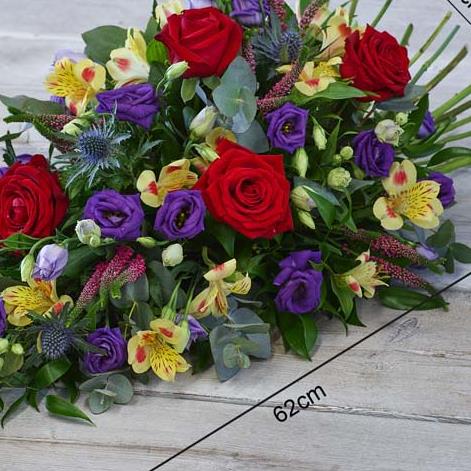 Large-headed red roses,purple lisianthus,yellow alstroemeria and veronica in pretty pinks, purples and yellow are set off by blue eryngium, luxury foliages are arranged together to create this woodland spray.