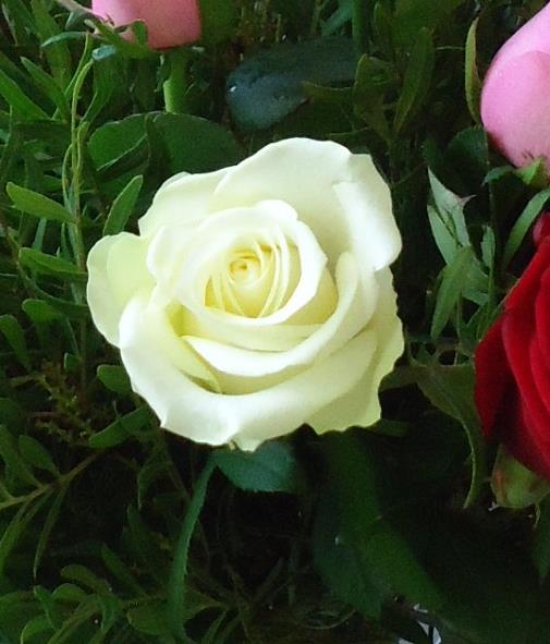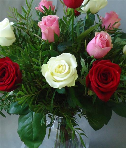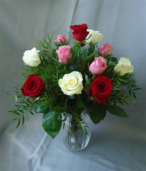 A A pretty mixture of 12 mixed red , pink and white roses presented in a vase for an instant display