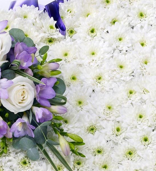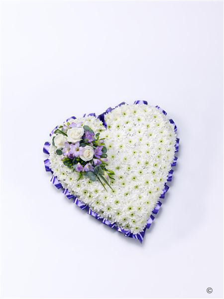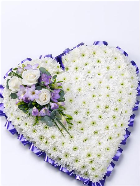 A classic heart-shaped design covered with a purple ribbon edge a mass of white double spray chrysanthemums and finished with a spray of white large-headed roses, lilac flowers 3 sizes available