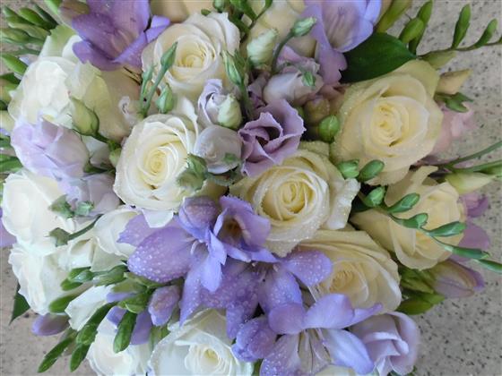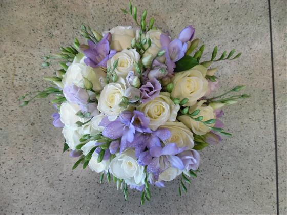 delicate posy of lilac freesia and white roses, a traditional design, perfect for a summer wedding