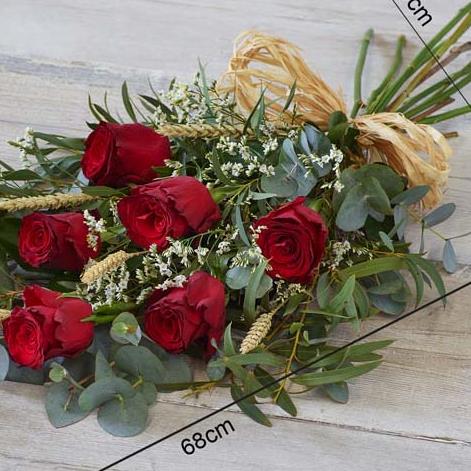 6 large-headed red roses are presented with limonium and wheat with mixed foliages and tied with a raffia bow. This item is environmentally friendly as it is made with all natural materials